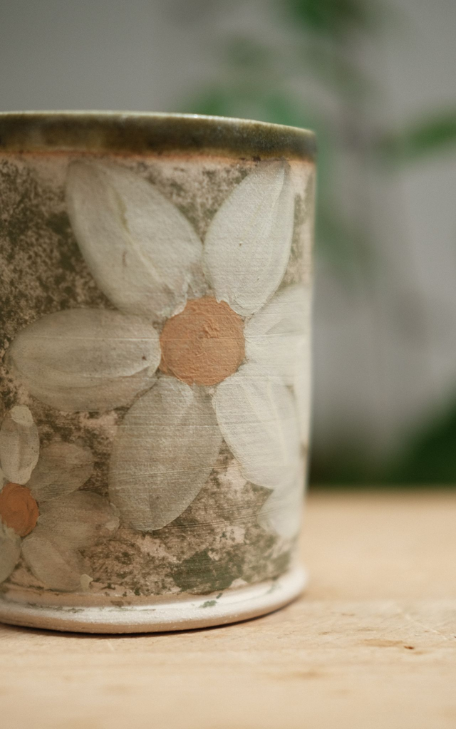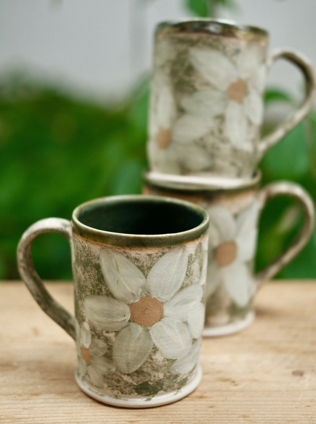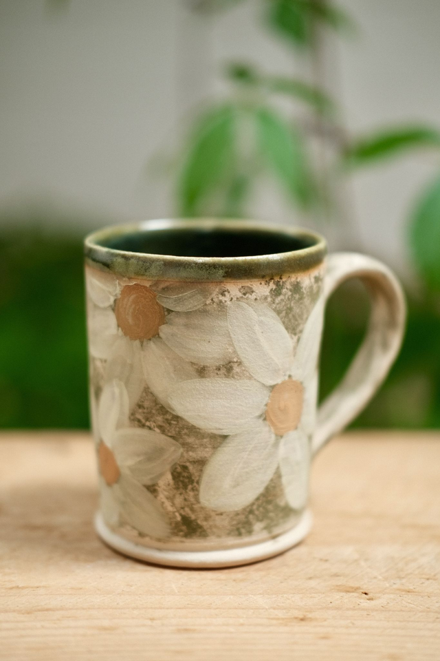 This handmade stoneware mug is a stunning addition to your coffee or tea routine. Each mug is individually handpainted with a beautiful daisy floral design, making them truly unique. The ceramic material keeps your drinks hot for longer, while the comfortable handle ensures a secure grip. This pottery mug is perfect for sipping your favorite hot drinks on a cozy morning or sharing with friends. Its gorgeous design provides a touch of nature to your kitchen and is sure to brighten up your day. Enjoy a cup of your favorite beverage in style with this one-of-a-kind floral mug.