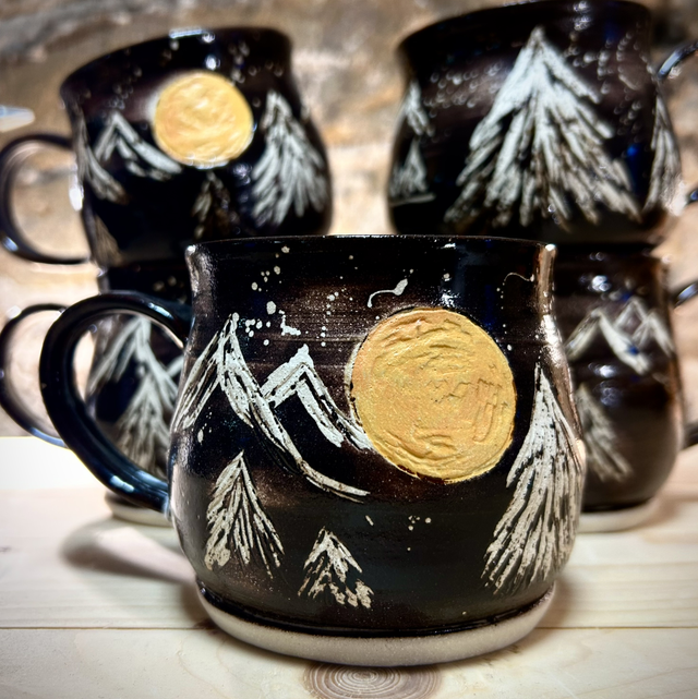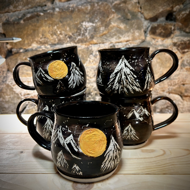 Handmade stoneware ceramic cup with a beautiful ‘full moon in the mountains’ design. 🌕