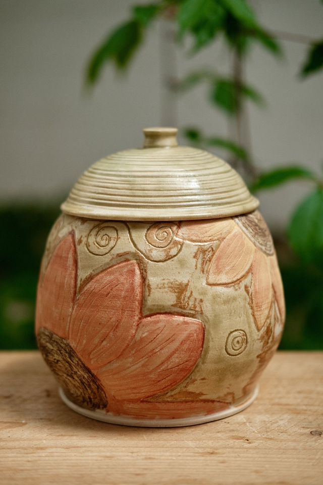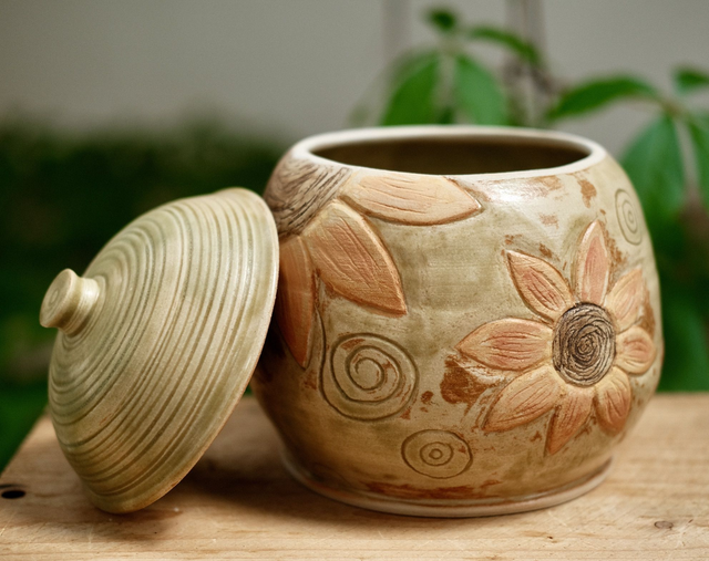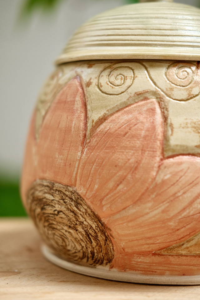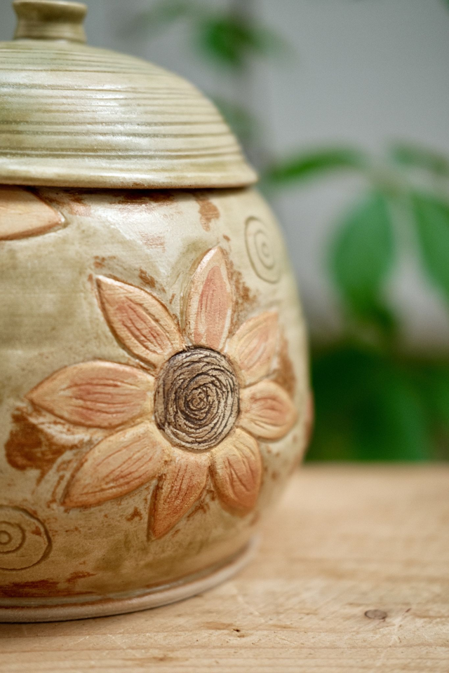 This stunning hand-carved cookie jar is both functional and decorative, making it the perfect addition to any kitchen. With a beautiful sunflower design, this stoneware jar is completely handmade and hand-painted, making it a one-of-a-kind piece. Not only is it perfect for storing your favorite cookies, but it also makes for a gorgeous centerpiece on any table or countertop. Its durable and sturdy design ensures that it will last for years to come. Add a touch of charm and elegance to your home with this unique and beautiful cookie jar.